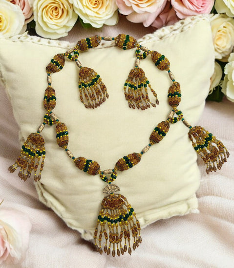 Honre la sabiduría divina y el poder nutritivo de Orisha Oshun en su camino Ololodi con este mazo de 10 cuerdas bellamente hecho a mano, elaborado con cuentas de vidrio checo de primera calidad en tonos vibrantes de topacio, verde y acentuado con toques de amarillo, un guiño sagrado a su profunda conexión con Orula.