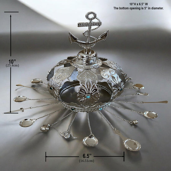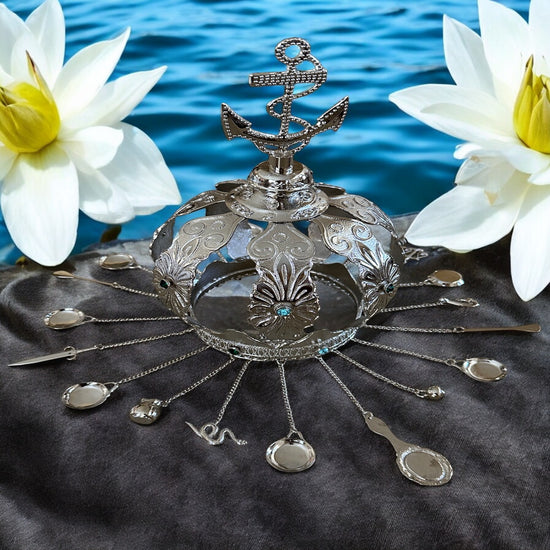 Note: This crown features the following symbolic tools: 1 scale, 1 sword, 1 scimitar, 1 mirror, 2 oars, 1 serpent, 1 basket, 1 eddy, 1 ship's wheel, 1 anchor, 1 jar, 1 fish hook, 1 fish, 7 plates, and is topped with an anchor.
